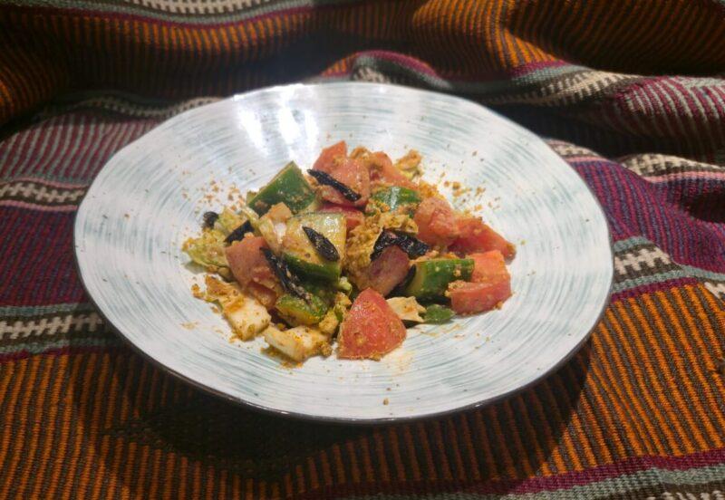 Cucumber, tomato, walnuts, pistachios, dried black plum, and sun-dried tomato slices with smoked paprika